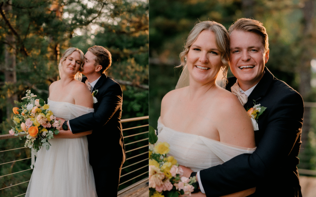One of my favorite wedding photography tricks? Sneaking the bride and groom out during dinner for golden hour photos for five minutes. The light? Unreal. We wandered the deck and the paths, mountains behind us, and made the kind of portraits that end up framed on the wall forever. Quick, quiet, perfect.